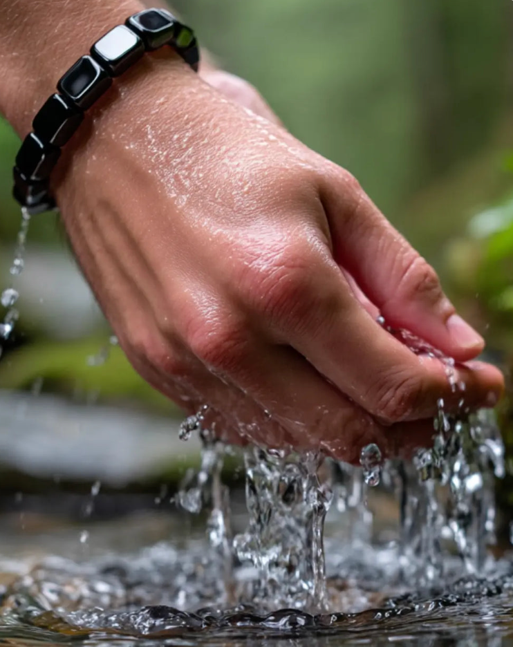 The HEMORA bracelet harnesses the natural magnetic field of hematite stone — a mineral recognized for centuries for its grounding and harmonizing properties.